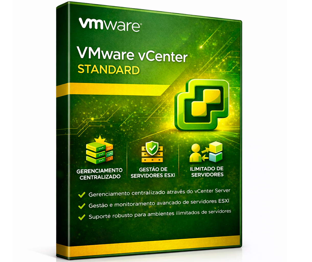 VMware vCenter Server Standard é a plataforma completa de gestão centralizada da VMware para ambientes de virtualização, permitindo administrar múltiplos hosts ESXi e máquinas virtuais de forma unificada, segura e eficiente.